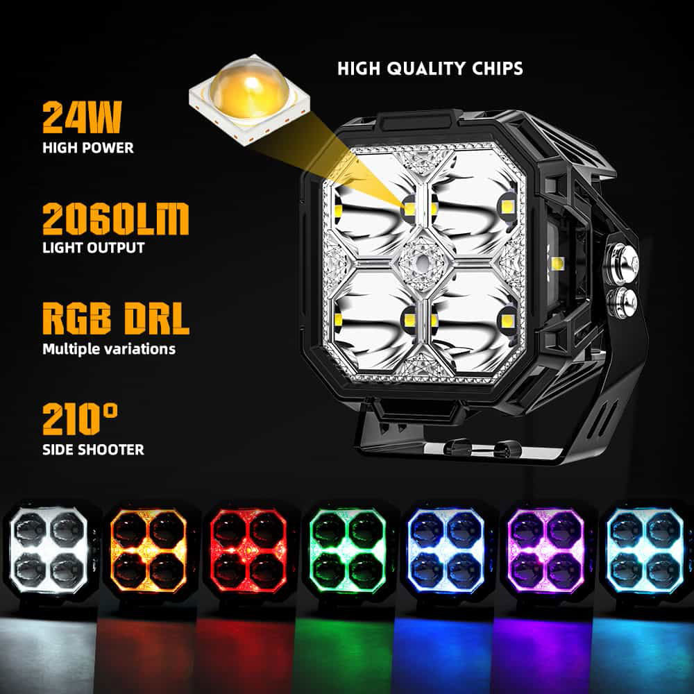 Ideal for off-road vehicles (UTVs, Jeeps), trucks, and SUVs requiring auxiliary lighting with both functional and aesthetic versatility. This upgrade maintains all existing performance advantages. The RGB DRL functionality is designed for users seeking a combination of advanced visibility solutions and personalized styling.